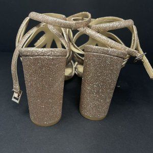 • Rose gold Glitter, Heels approx 4 inches, top straps wrap around ankle, only used one time for about 2 hours at indoor formal event