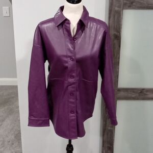 Badgley Mischka aubergine purple lamb touch stretch vegan leather schacket size Small NWT. this shirt jacket is 2 way stretch with 6 button closure 2 button cuff and collar. 100% polyurethane. sleeve 23" pit to pit 22" length 28