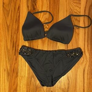 Badgley Mischka blue bikini bathing suit with matching top. Top is lined and is adjustable. Worn once. Excellent condition. Both top and bottoms have beading. Size 6.