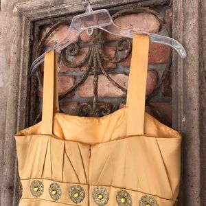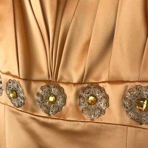 Deluxe Badgley Mischka gold-y satin formal cocktail dress, knee length, with ruched bust and straight bodice embellished with gorgeous jeweled medallions. Simple yet uber elegant! Perfect for any formal evening engagement. I wore this ONCE to a super chic soirée dinner in Nola with fuschia Laboutin slingback heels and a sheer fuschia chiffon wrap. Got so many compliments! It’s a 10 but had it taken in on sides. It’s a stunner with two wide shoulder straps, like new. Showstopper 💥💥