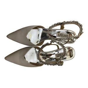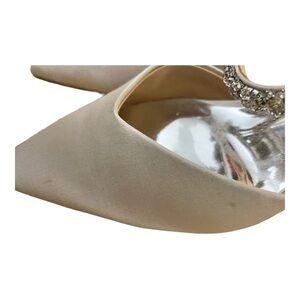 Badgley Mischka The Galaxy Crystal Embellished Evening Shoe delivers a sophistication that’s out of this world. The showstopping ankle strap features illustrious crystal detailing on the closed, pointed toe. The modest heel features a textile upper and sits on a cushioned footbed.satin these have very little scuff one back heel a small dot one shoe. Size 7.