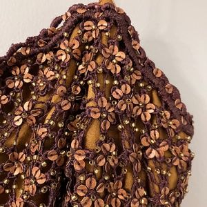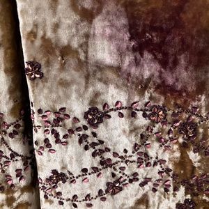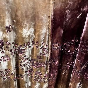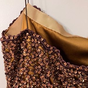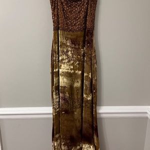 Bodice of deep gold and bronze colored sequin and bead flowers over luxurious golden bronze silk charmeuse. Spaghetti straps have additional length to allow for tailoring. Body of dress is velvet with sequin and bead embellishment of flowers and leaves. Velvet has been dyed from light gold to dark bronze, giving beautiful depth.