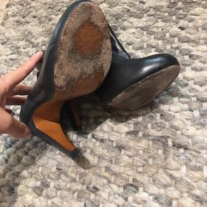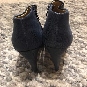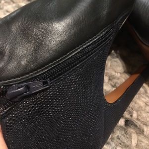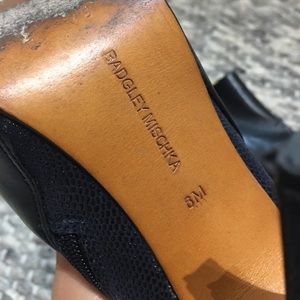 Great preloved booties! Badgley Mischka mark and James leather booties size 6 black leather and dark sapphire textured backs, very high end luxurious looking, and paid a pretty price for them. Unfortunately they no longer fit me. Has a hidden 1/2 inch platform so they are very comfortable. Heel is about 4 inches, feels more like 3 with the hidden platform