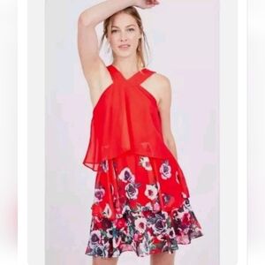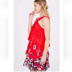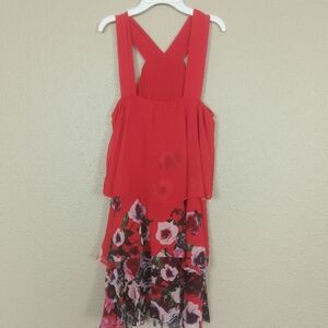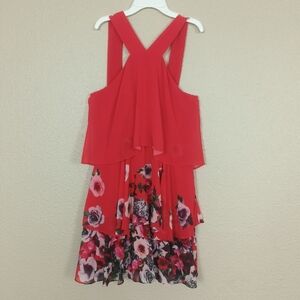 Badgley Mischka popover red short sleeveless dress with tiered ruffles floral size 12