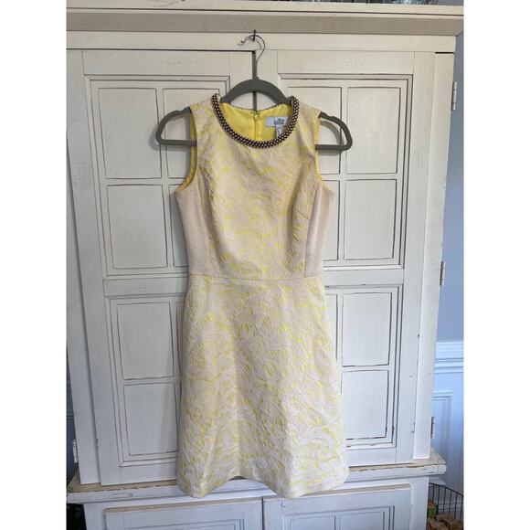 Badgley Mischka size 2 yellow dress with almost a lace overlay but it’s all part of the same fabric. Zips in the back. Measures 16” from armpit to armpit. 13 1/2” across the waist and it is 36” long. Fully lined.