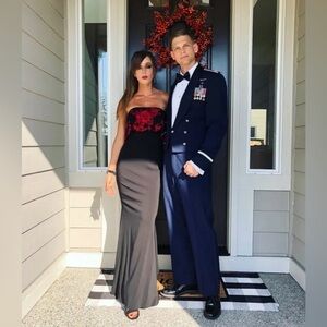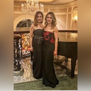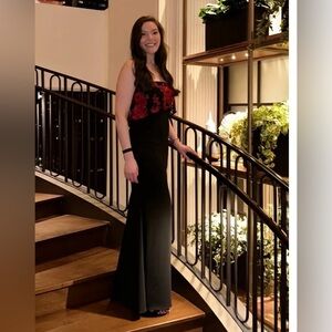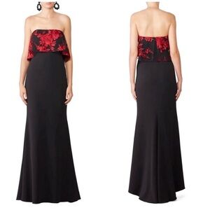 Black/red printed odessa & lace (Odessa: 98% Polyester, 2% Spandex, Lace: 80% Polyester, 12% Silk, 7% Nylon, 1% Elastane). Gown. Strapless. Straight neckline. Hidden back zipper closure. Fully lined. Boned bodice. See size and fit tab for length. Imported.