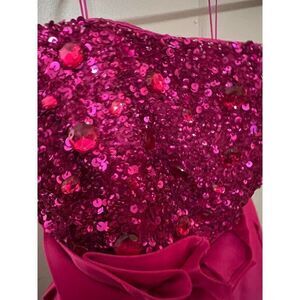 Beaded-bust bubble dress by Mark + James by Badgley Mischka. Vibrant pink color, strapless neckline, beautifully beaded bodice, pleated bubble skirt. Such a fun dress!