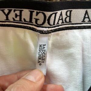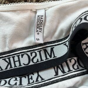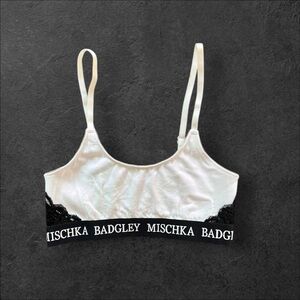 Badgley Mischka, featuring a bralette and matching briefs. The set has black lace trim and a black waistband with the brand's name printed on it. From a Sample Sale