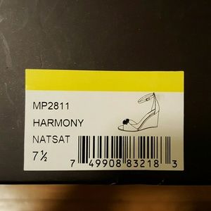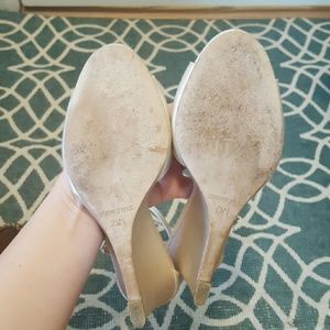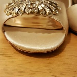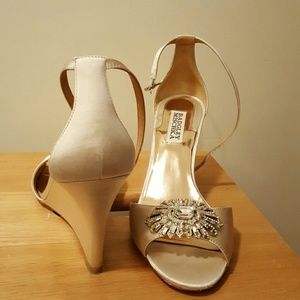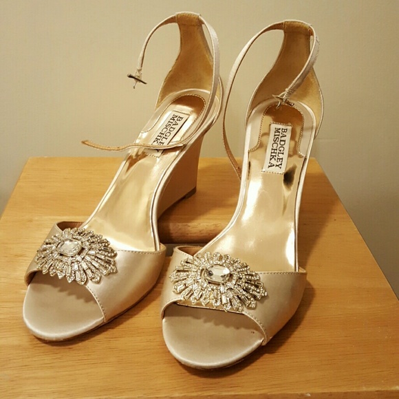 Badgley Mishka Harmony wedged heels in size 7.5. These heels come in a champagne/ivory satin with a gorgeous crystal detail. I wore these only once for my wedding day. Still love them but want to give them anorher life other than sitting in my closet. Comes with the box.