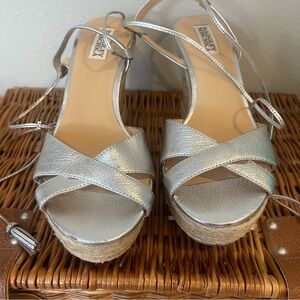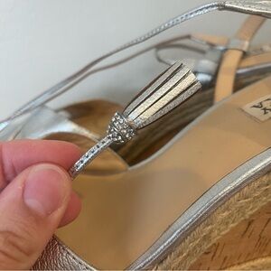 Badgley Mishka Wedges Women’s Sz 7.5 Silver Leather Tie Embellished Bridal Boho