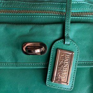 This Badgley Mishka shoulder bag boasts a vibrant grass green exterior and is crafted from high-quality leather, ensuring durability and longevity. The bag features a medium size, making it perfect for everyday use. The leather handles provide a comfortable grip, and the bag's spacious interior is lined with green and white polka dot fabric. Liner in perfect condition-inside has one zippered pocket, and three open pockets. Outside has a zippered pocket, and a turn key pocket-bag has a zippered closure. This bag shows very little wear, and color is refreshing! Measures 14 inches x 16 inches, handle length is 9 inches.