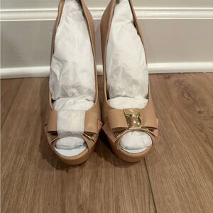 Badgley Mischka Conary Tan Peep-Toe Pump Heels with Bow Detail