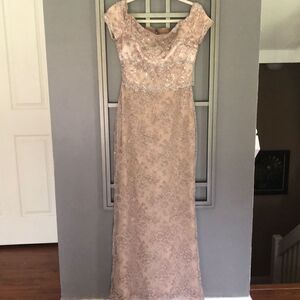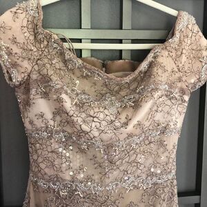 Badgley Mischka beige beaded, black tie, mother of the bride evening gown off the shoulder size 4