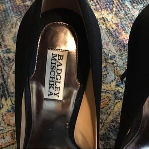 Black shiny satin finish with tiny black pearl detail on pleated bow.