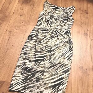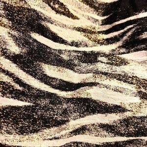 NWOT. Zebra print with gold metallic. Back zipper closure. Has a small slit in bottom back. Sleeveless. Pleated in the front waist area. Bust Measurements laying flat is 16 inches. Length is 37 inches. 60% Polyester, 12% Cotton, 13% Viscose, 15% Metallic. Pls see pictures for details. Thank you