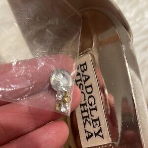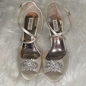 Badgley Mischka Cream Abigail Evening Wedge Sandals, size 10. Like new condition! No wear on soles at all. The Abigail sandals by Badgley Mischka have a gorgeously formal silhouette with crisscross straps and an adjustable buckle closure for a secure fit.
