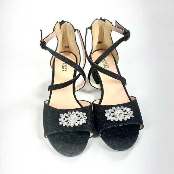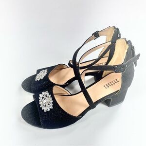 Badgley Mischka pernia gems formal black low strappy heel with rhinestone size 5. Perfect for a holiday wedding, flower girl, or mother of the bride. New Year’s Eve? Little black dress? 2” heel.