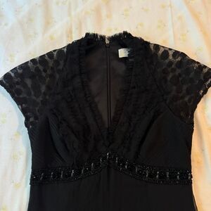 Y2K Badgley Mischka vintage midi dress with bejeweled waist belt and lace cap sleeves. Chiffon flutter skirt and ruched details on bodice. #y2k #vintage #whimsigoth #corpgoth #corporategoth