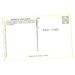 Classic collectible postcard featuring the rugged terrain of the Badlands in South Dakota. Published by Rushmore Photo with vivid Plastichrome Ektachrome printing by Florence J. Beckers.
