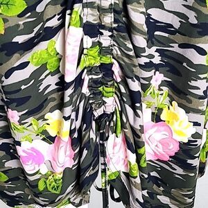 Bae City Green & Black Camouflage Top, Pink Roses, Ruching Down Front, Sz 1X