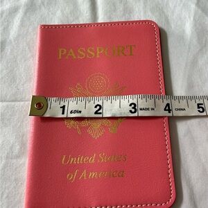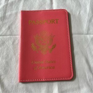 Stylish pink passport holder with gold embossed design. Perfect for travel.