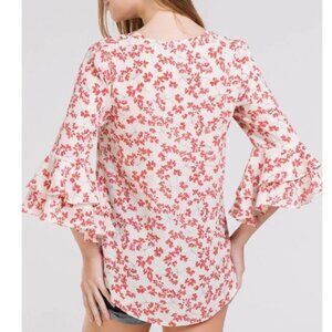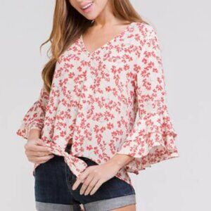 Baevely Floral Tie-Front Blouse - Red and White Size Small