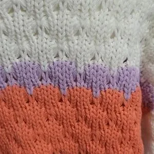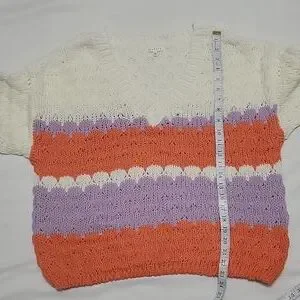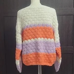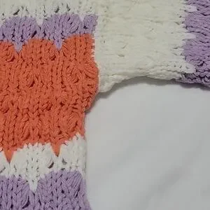 It is a very soft sweater in white, orange and lilac and has a bohemian vibe with its pretty balloon sleeves. The knit is such that I would recommend wearing a shirt underneath (see picture).