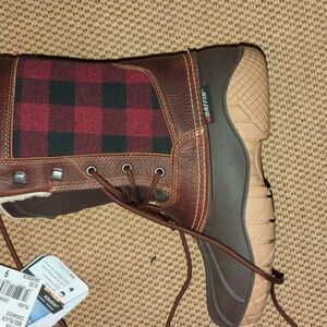 Cozy winter boots with a striking red and black plaid pattern. Ideal for chilly days.