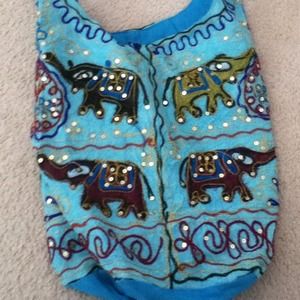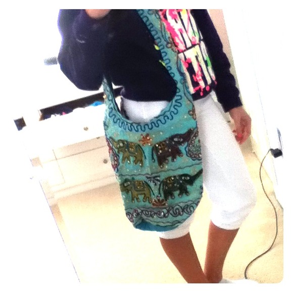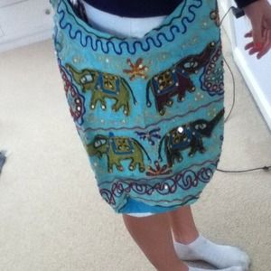 This is a very expensive bag from Kingston, Jamaica. Handmade, it is covered with golden sequins, elephants, and tons of different fabrics. Brand new.
