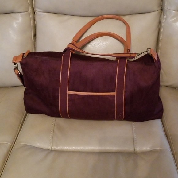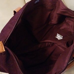 Brown cord trimmed in tan, one slit pocket on front, handles and long strap. NWOT