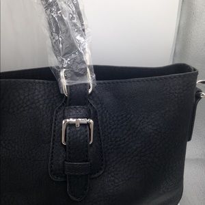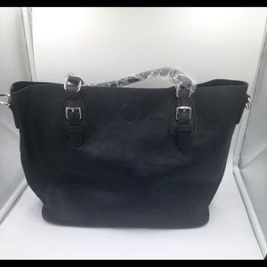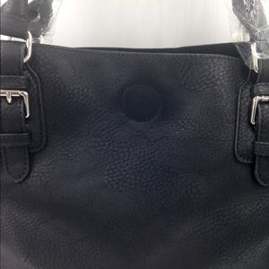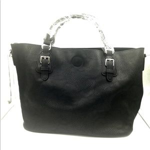 Very roomy bag! Textured outside with a nice suede inside. Shiny silver details on the outside with short handles. No compartments. Measures approximately 11.5 inches high. 17.5 wide. Black .never used.