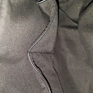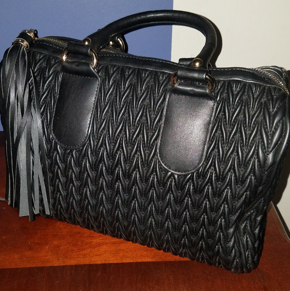 Black with tossels inside zipper pocket and 2 additional to but keys, lipstick, pen etc