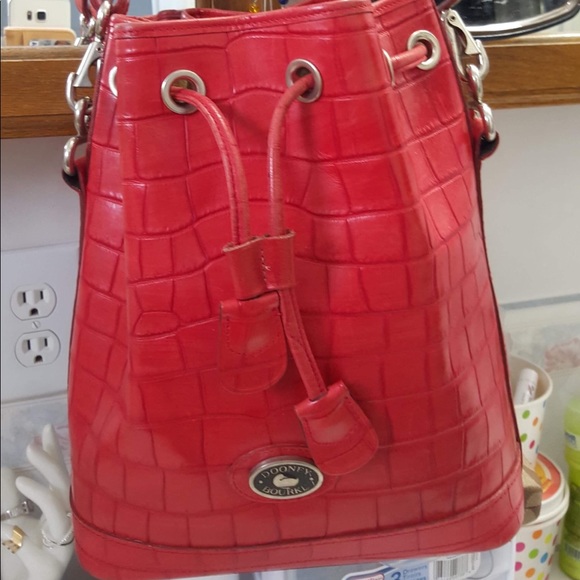 Small Orange Red Dooney and Burke crocodile bucket bag with long strap. One corner with wear as seen in the picture. My loss is your gain. Good condition smoke free home.