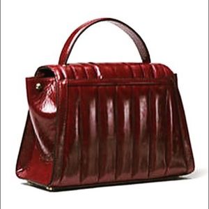 The Whitney satchel combines sophistication and versatility in a structured top-handle silhouette crafted from glossy crinkled leather with quilted stitching. Complete with a detachable shoulder strap and pyramid-stud hardware, it features winged side gussets for architectural shape. Consider it the perfect complement to weekday ensembles.