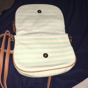 Blue and white striped purse. Lots of pockets. Used. Brown strap. Can be carried across body or not.