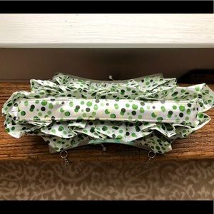 Cute and whimsical white asymmetrical clutch with yellow and green dots, green lining, 12” x 6”, non-designer item.