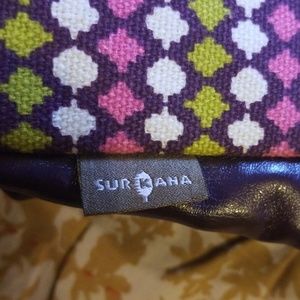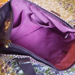 Beautiful dark plum tote bag. Cool vintage patterned fabric. Light magenta fabric inside with 1 zipper pocket and 2 open pockets. 1 zipper pocket on the outside.