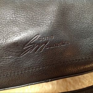 Soft leather, beautiful gold hard wear, this is the quality that Stone Mountain is known for! Inside clean, three pockets, key ring holder. Outside zipper pocket. Two straps. Note last picture with flaw in leather. Very little scuffs.