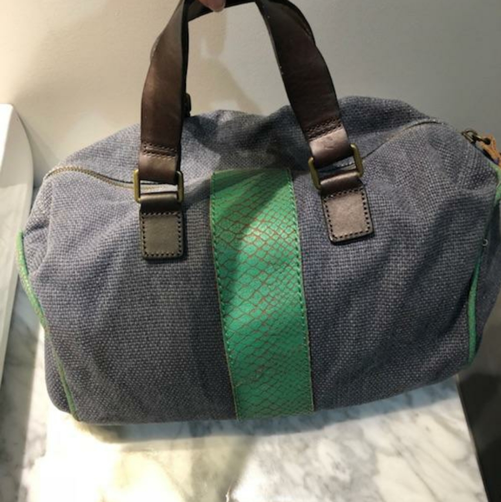 Selling a beautiful blue canvas, lime green and brown leather Liebeskind Berlin brand large tote style purse In excellent condition