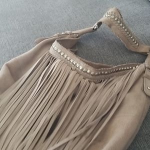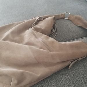 Taupe color or more on the gray. Suede hobo bag long tassels silver studs. Beautiful bag still selling for 350.00 great bag. Used mabe 5 times.