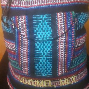 Cute bag with back straps has a front pocket that zips and velcros. Bought and made in cozemel, Mexico.