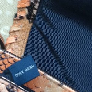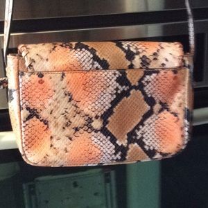 A Cole Haan python design leather bag. It has one outside pocket.There are 6 credit card slot under the flap that has a magnetic closure.There are two inside pockets one with a zipper closure.It has a long shoulder strap.