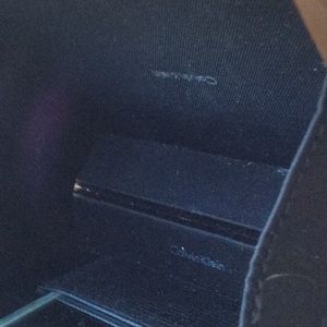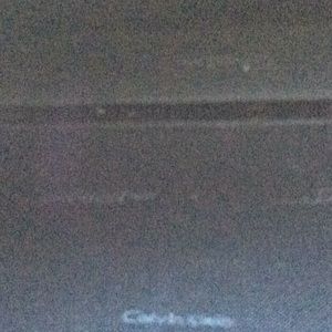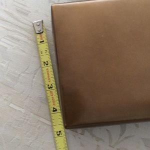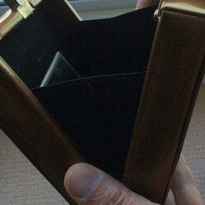 A small square bag by Calvin Klein.it has a short wrist strap and one inside pocket with a mirror in it.It has the dust cover.It is 6”x 41/2”