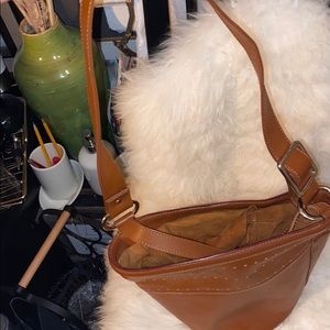 Bucket bag leather with shoulder strap and hand strap minor scratches to one side at the bottom , inside is clean so is out side miner creasing to one side that usually happen to leather .
