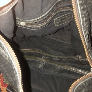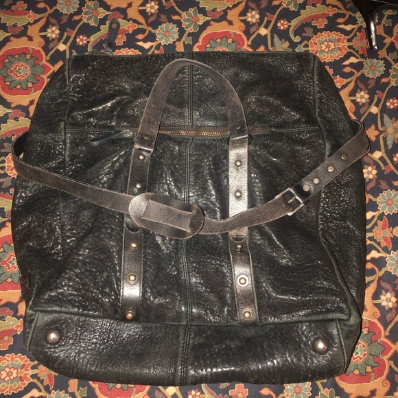 17x20x6 BIG Black bag, heavy leather, inside side pocket zipper doesn’t work but pocket is usable. Bottomless pit of a bag- holds a ton!