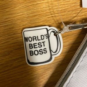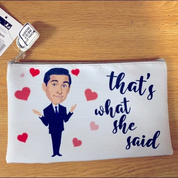 This Pencil case is inspired by the Office and has a drawing of Michael Scott on both sides with red hearts. The pencil case says in cursive lettering on both sides “That’s what she said.” The zipper is a mug that says “World’s Best Boss.” This is made by Universal innovative designs.