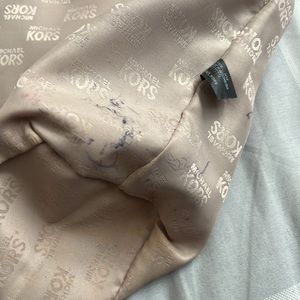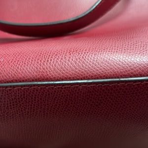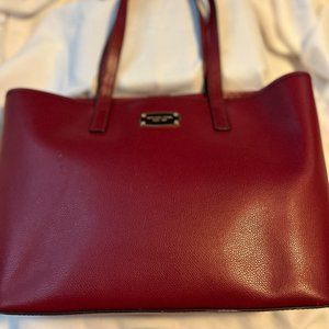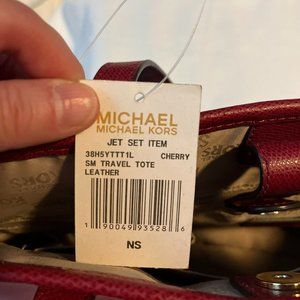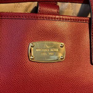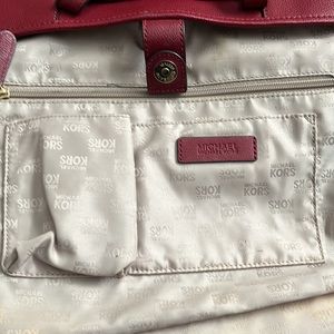 Cherry Red leather Michael Kors travel bag. Magnetic closure and two straps. Inside is lined and has four storage compartments and one large zippered pocket. Pocket on back of bag is perfect for cell phone or keys. Smoke-free environment.