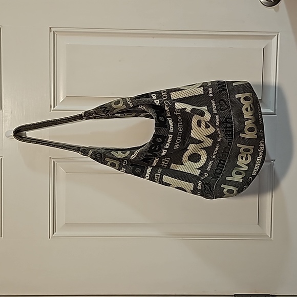 Women of Faith shoulder bag. Medium size bag at 12 inches by 9.5 inches. Includes 1 zipper pocket on the side. I am sorry I am unsure of the brand