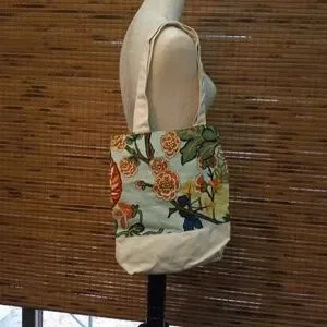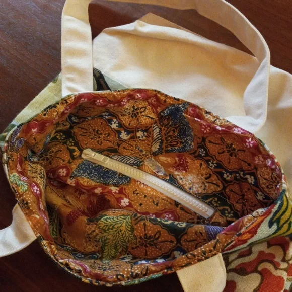 open top bag with a generous zipper pocket. 13 inches wide, 14 inches in length, handle drop 9 inches, gusset 2.5 inches