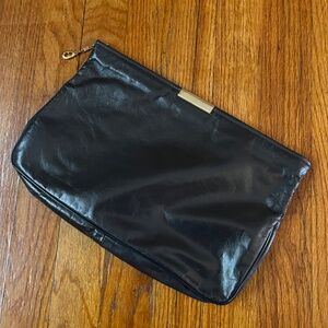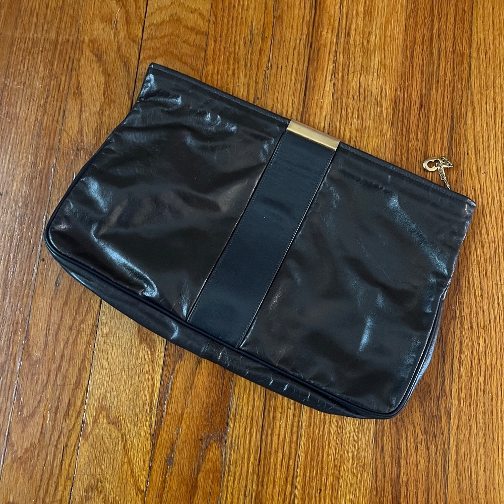 Cute Charcoal Leather Clutch . With blue leather stripe accent. Zipper closure. 1 Compartment. Faux Suede lining . Preowned but great condition.!
